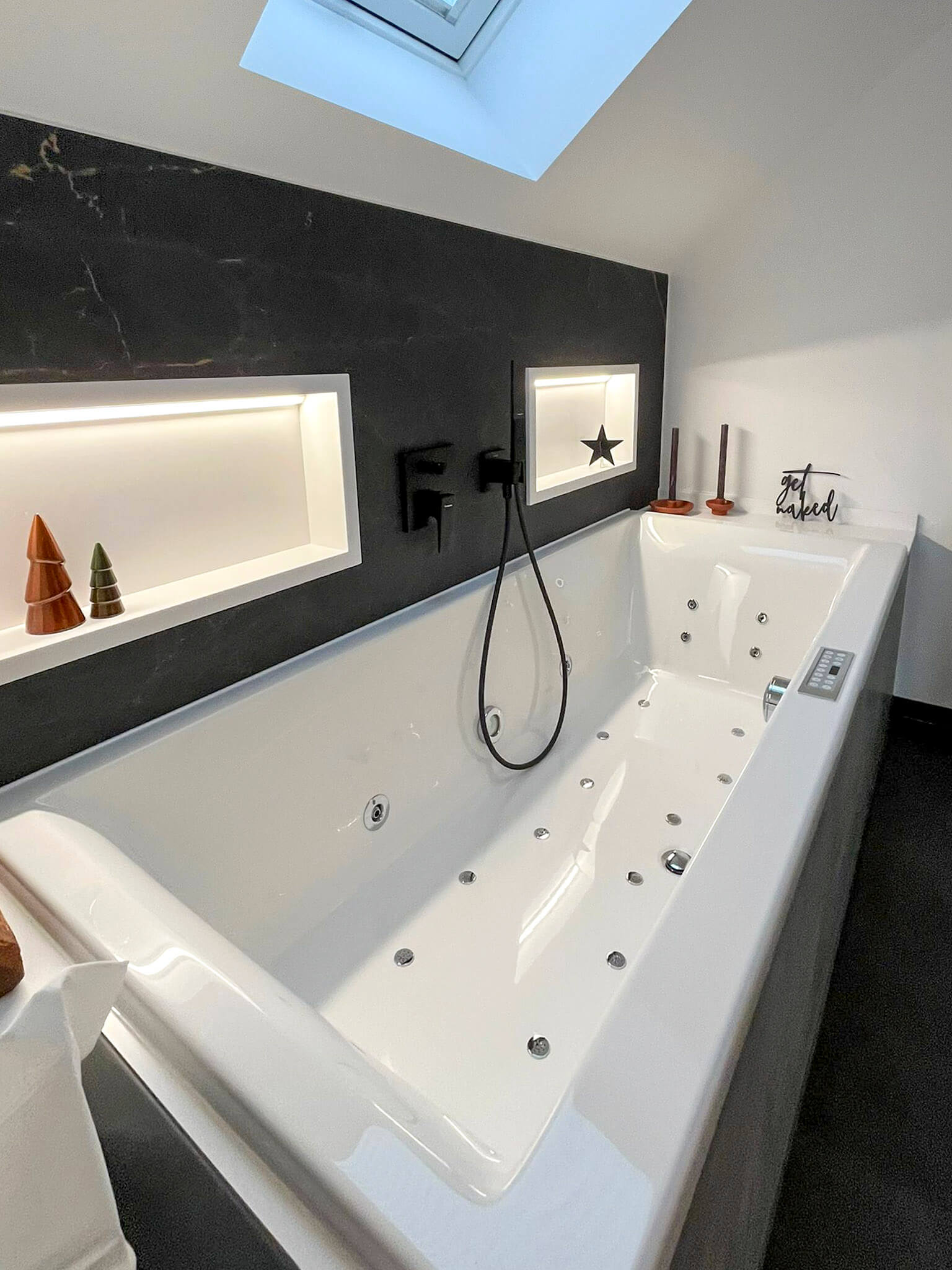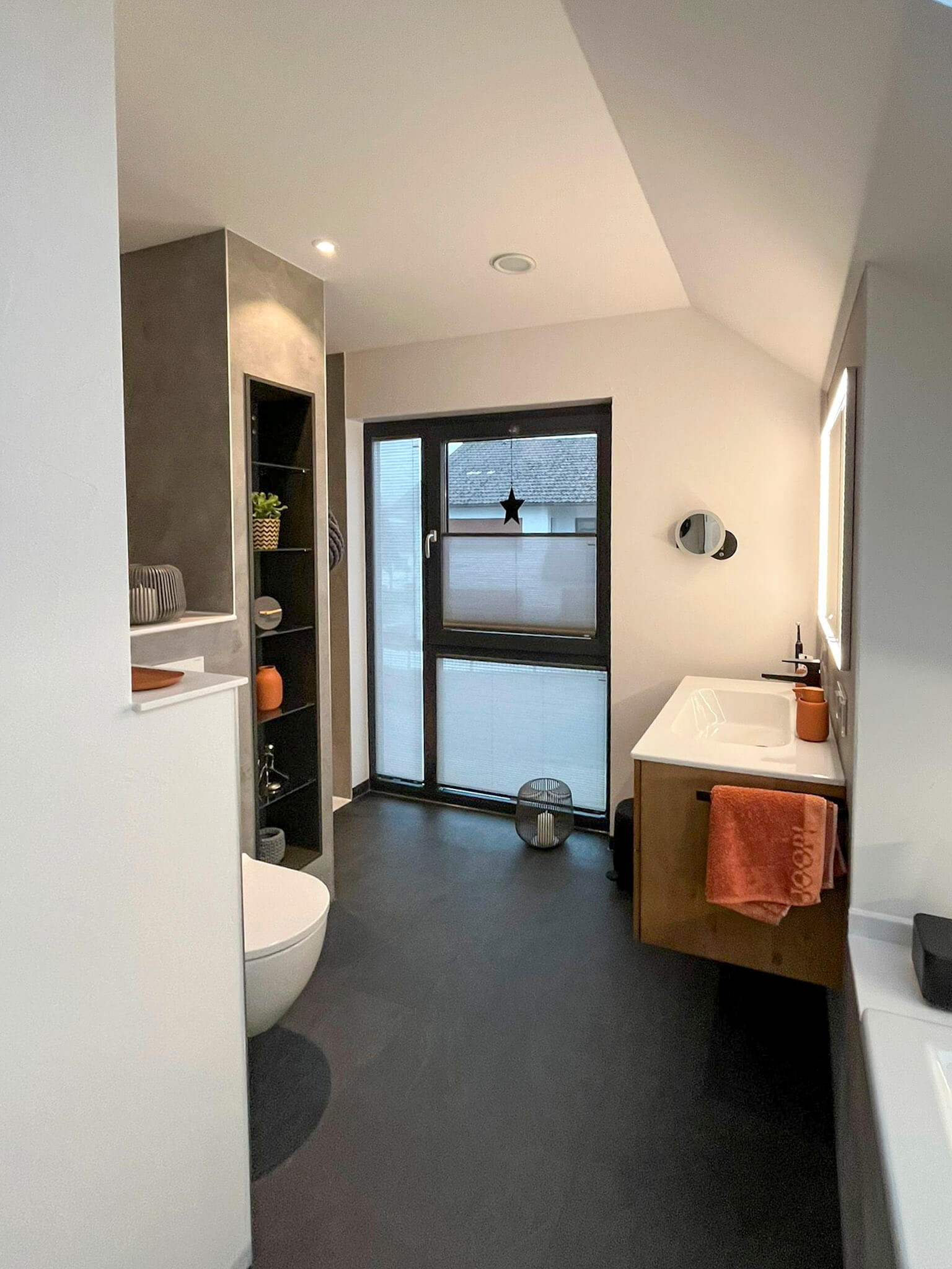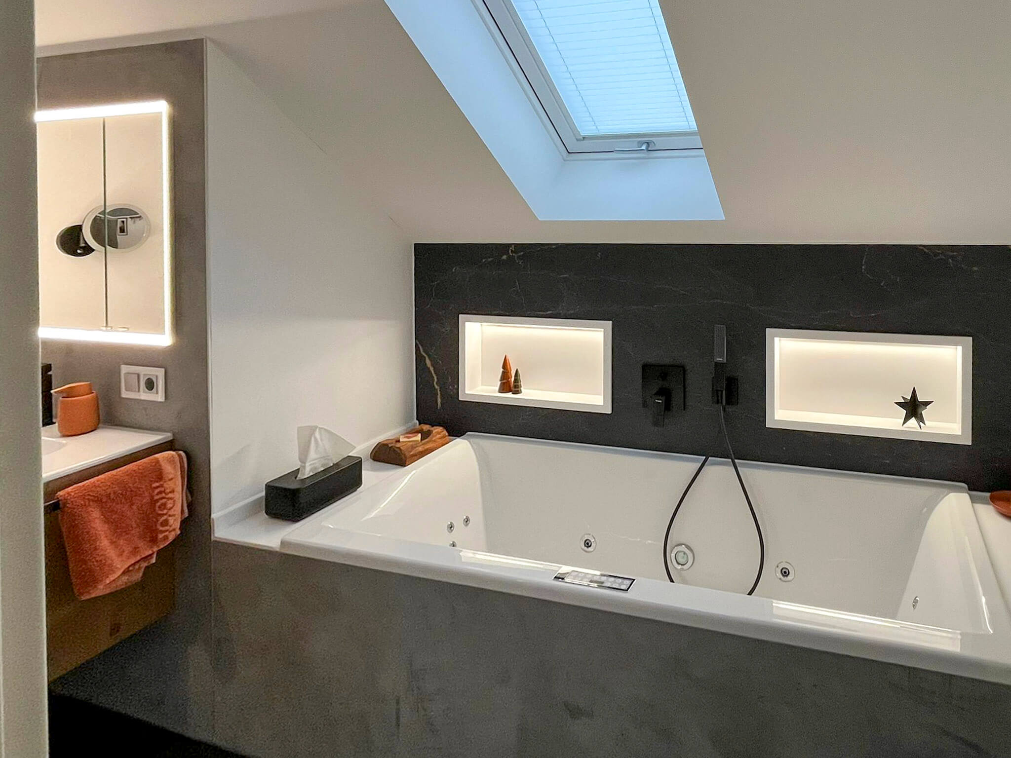Das Hauptbad drückte durch seine geschlossene Schräge den Raum nach unten und ließ ihn dunkel wirken. Ungenutzter Platz unter der Schräge wurde zudem zum Schmutzmagnet. Indem wir die Wand vorgezogen haben konnten wir unter anderem Technik für einen Whirlpool installieren und den Raum so „sauber und geschlossen“ wirken lassen. Durch ein von uns eingebautes Dachfenster konnten wir den Raum aufhellen und für einen Ausblick in den Himmel aus dem Pool sorgen.