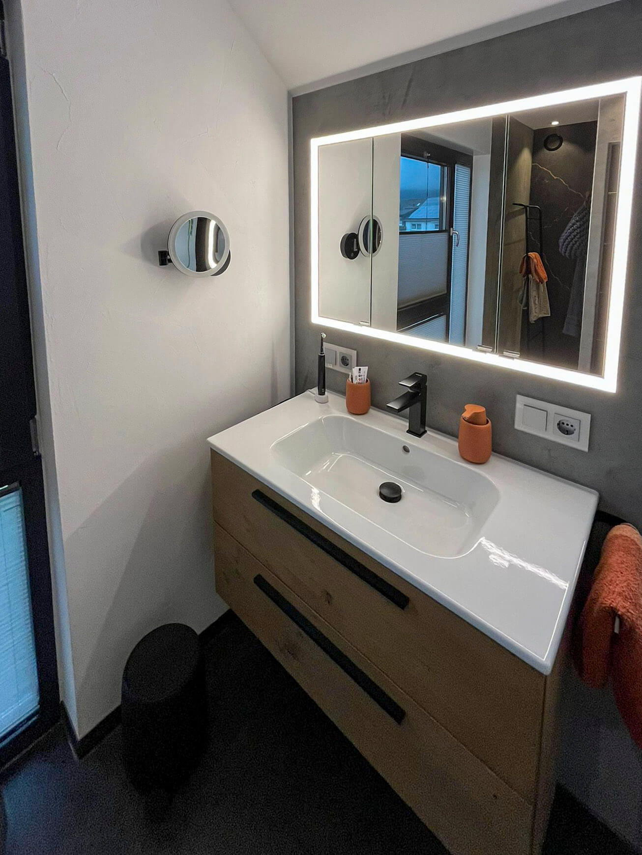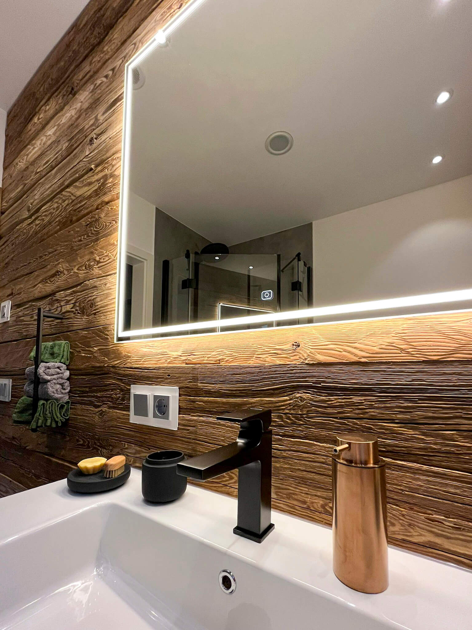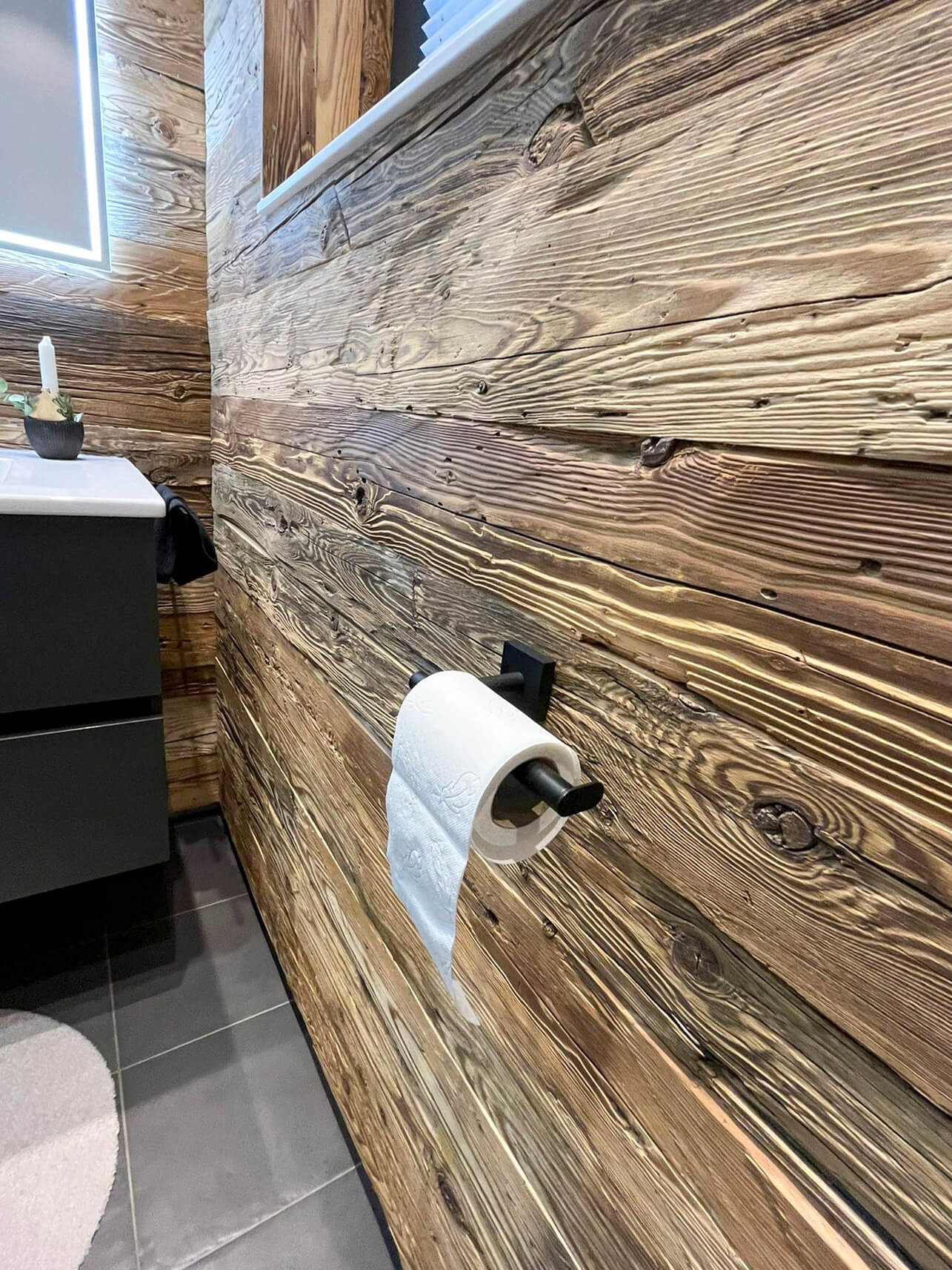 Bei diesen Kunden durften wir Bad und Gäste WC sanieren, da beide aufgrund eines Wasserschadens renoviert werden mussten. Während der Planungsphase erzählte uns die Kundin von ihrer Begeisterung für Echtholz. Aus dieser Idee heraus installierte unser Schreiner eine Echtholzwand im Gäste WC und durch Effektbeleuchtung und schwarze Accessoires entstand ein Hingucker, der das Auge nur schwer loslässt. Hier hat sich der Mut der Kundin bezahlt gemacht.