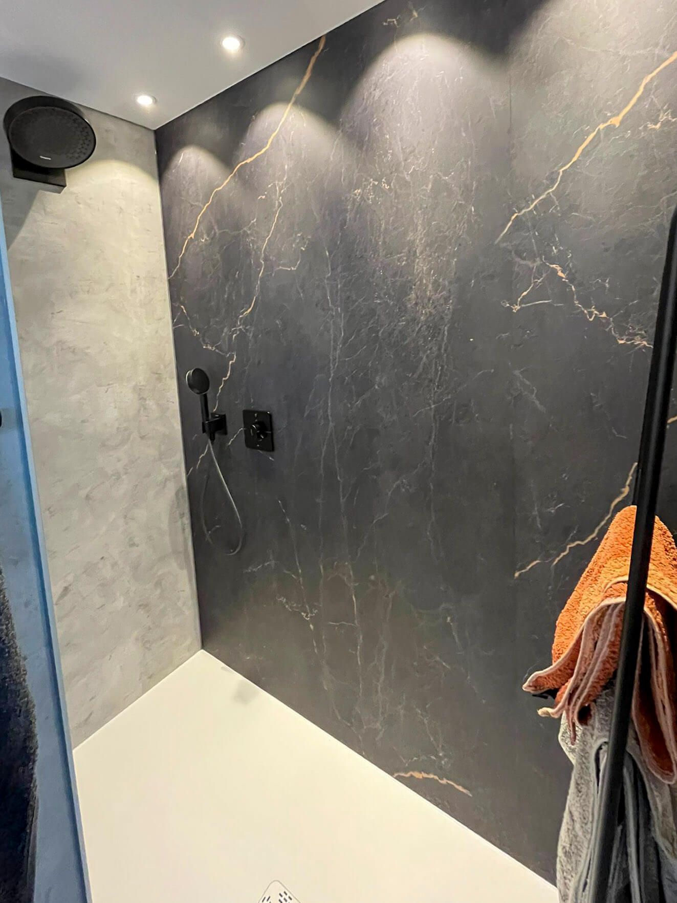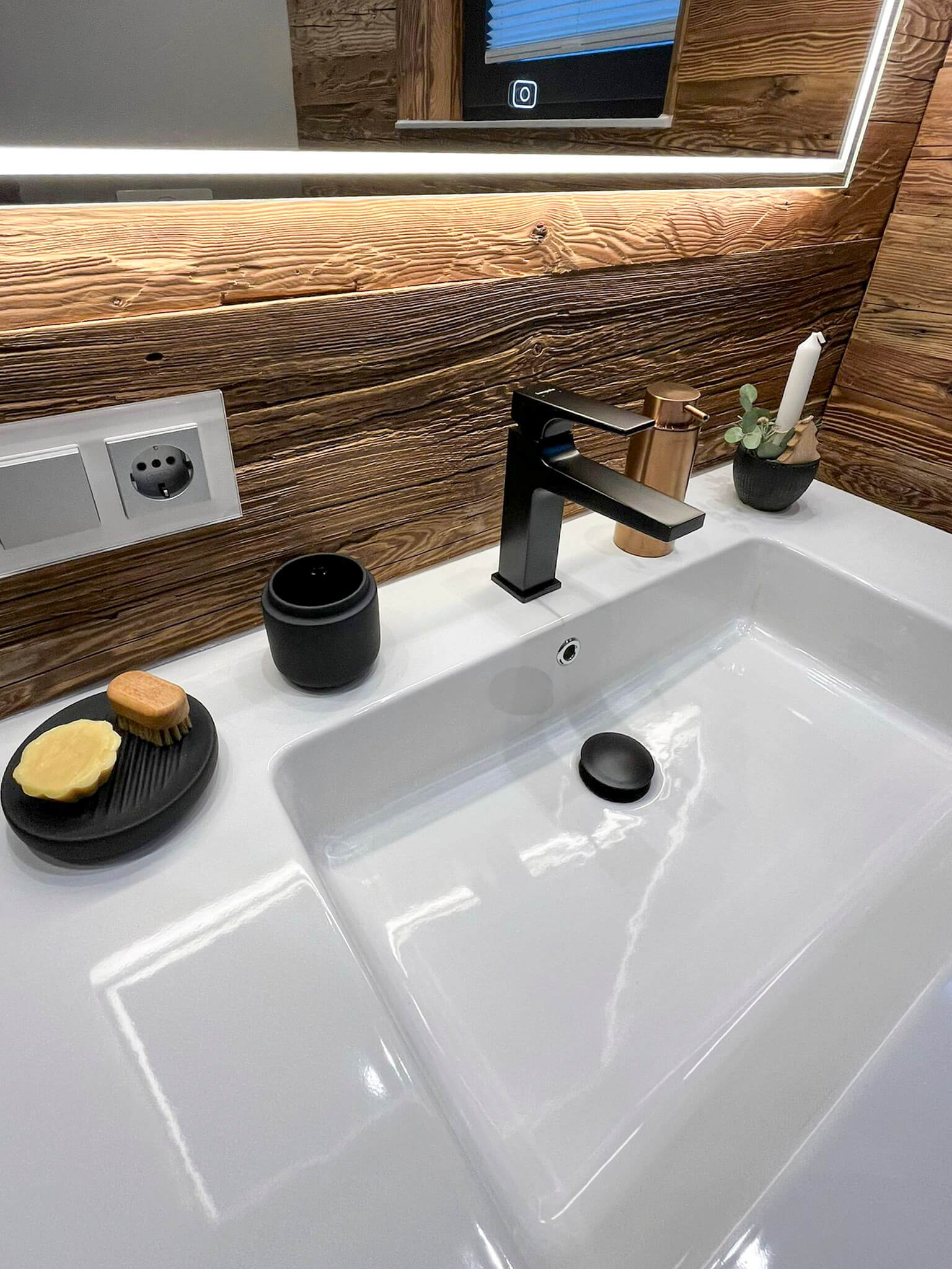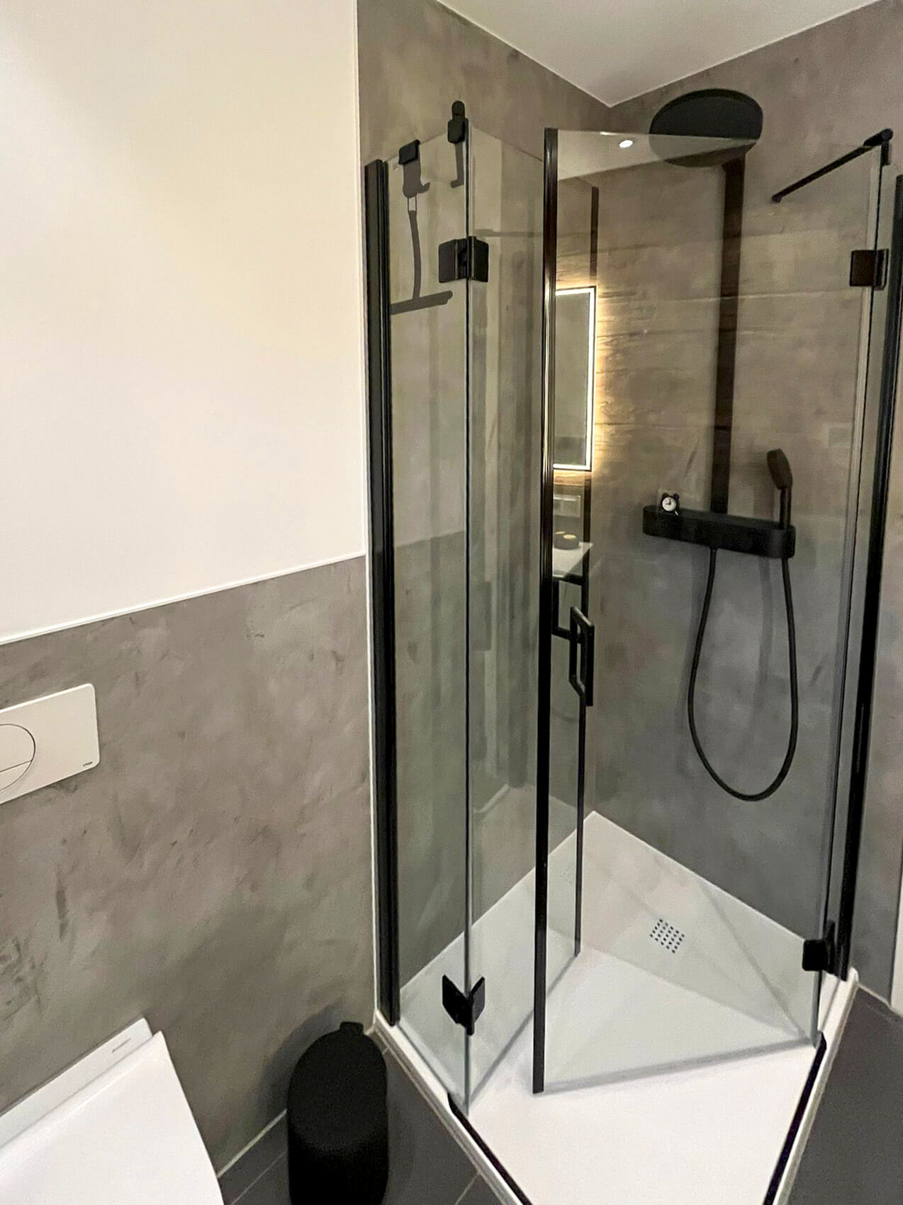Bei diesen Kunden durften wir Bad und Gäste WC sanieren, da beide aufgrund eines Wasserschadens renoviert werden mussten. Während der Planungsphase erzählte uns die Kundin von ihrer Begeisterung für Echtholz. Aus dieser Idee heraus installierte unser Schreiner eine Echtholzwand im Gäste WC und durch Effektbeleuchtung und schwarze Accessoires entstand ein Hingucker, der das Auge nur schwer loslässt. Hier hat sich der Mut der Kundin bezahlt gemacht.