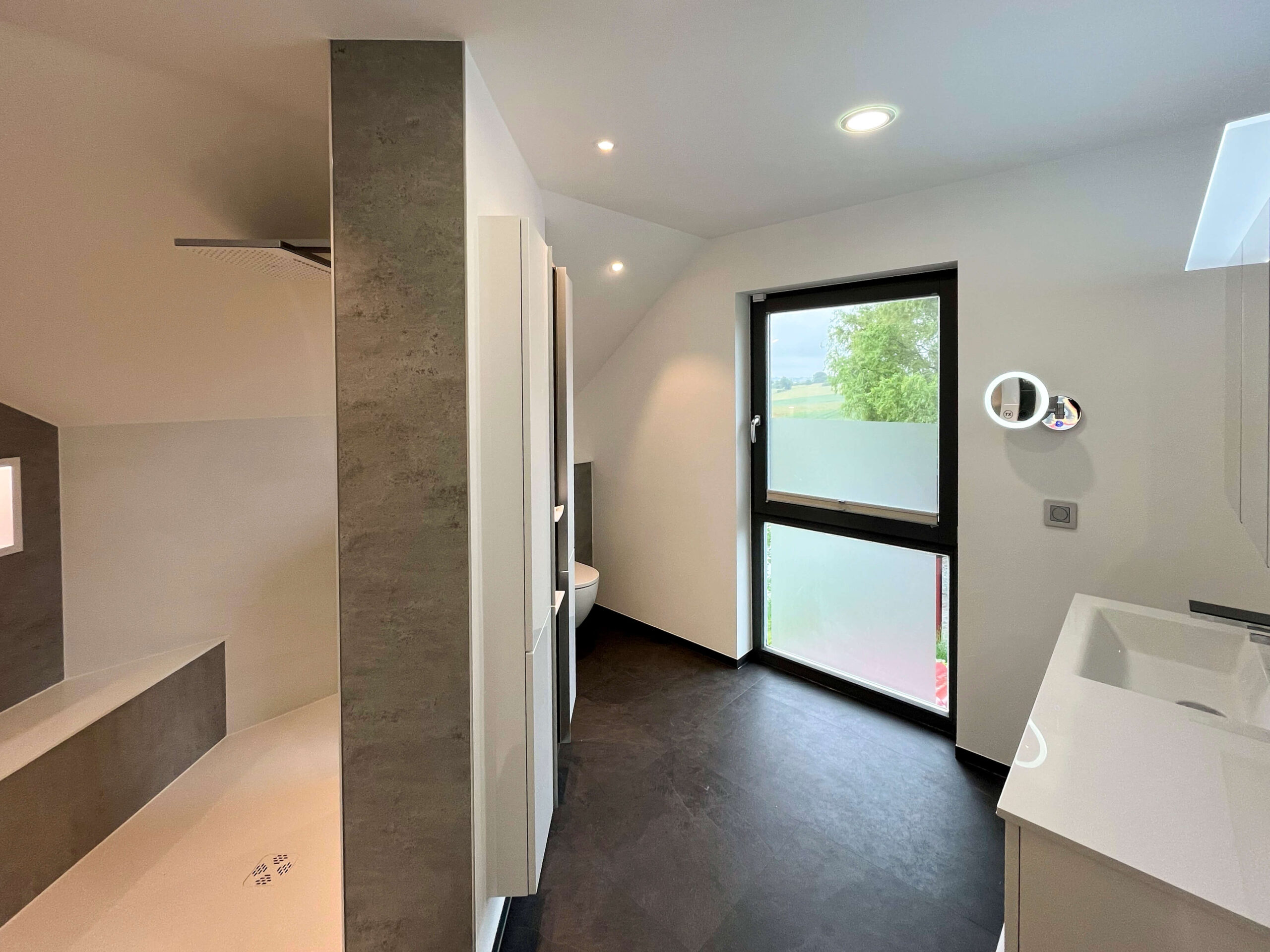 Dieses Bad im Raum Gießen ist ein echtes Unikat und zeigt, wie viel Potenzial selbst in komplexen Grundrissen steckt. Die Kunden wollten das Maximum aus einem schwierigen Raum herausholen und suchten eine Lösung, die Funktion, Design und individuelle Wünsche vereint.
