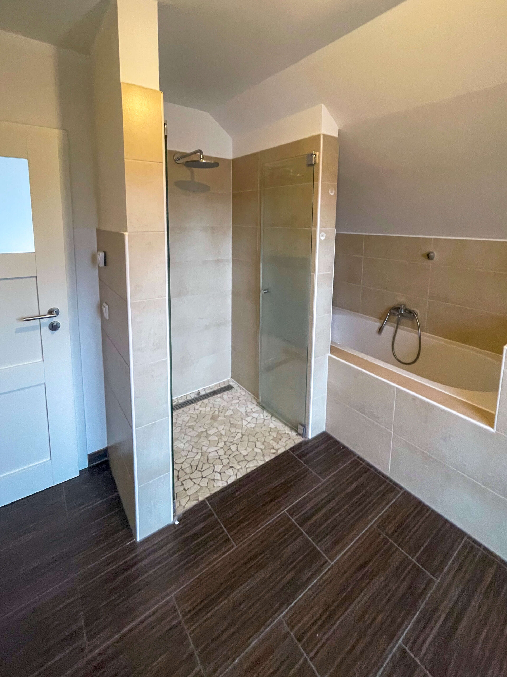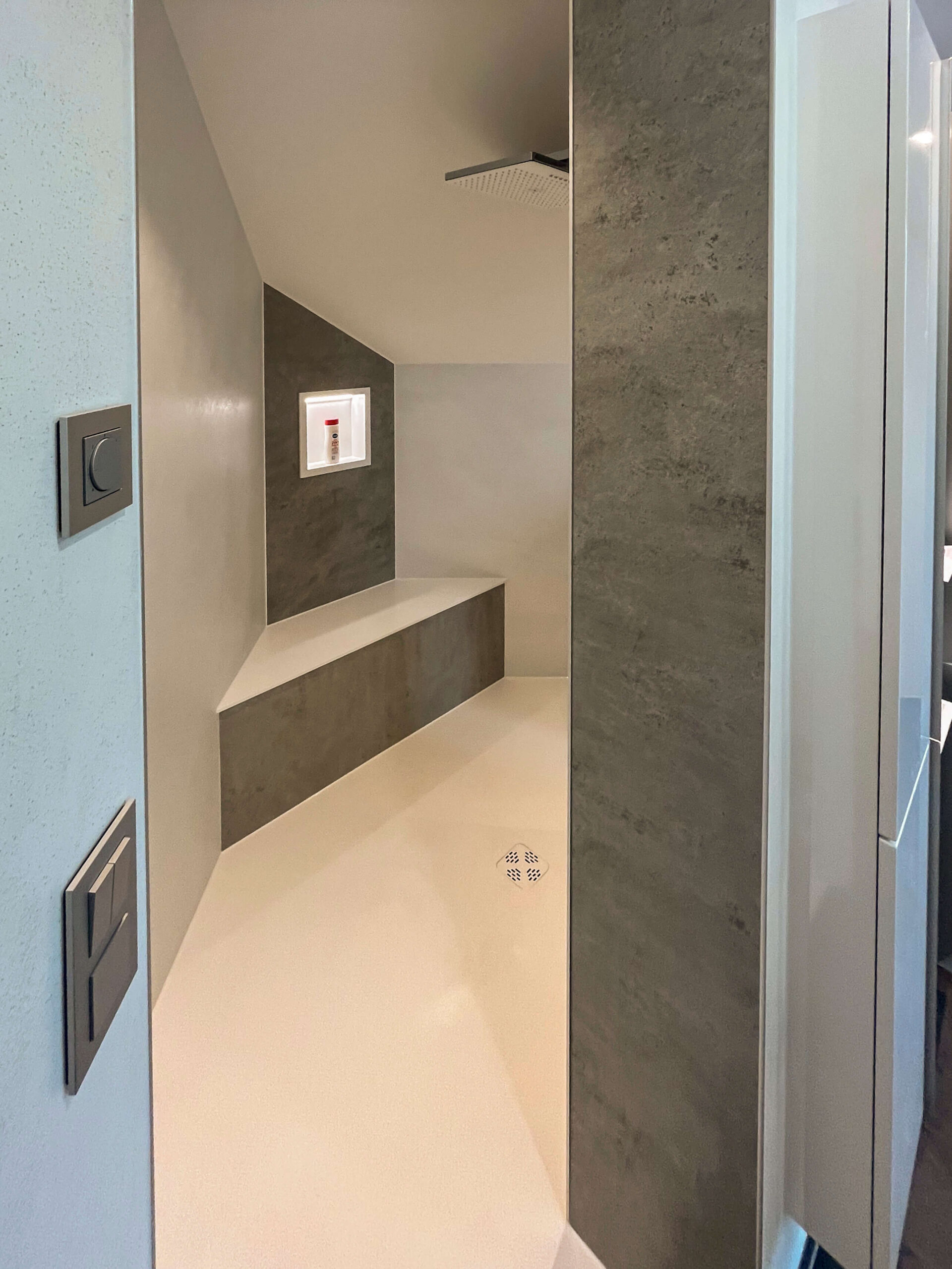 Gemeinsam entwickelten wir den Plan für eine sechseckige Dusche, die perfekt in die vorhandene Schräge integriert ist. Das Ergebnis ist eine außergewöhnliche Duschlösung ganz ohne Glas und mit einem freien, offenen Raumgefühl. Eine beleuchtete Nische schafft zusätzlich angenehmes Licht und unterstreicht die besondere Atmosphäre des Bades.