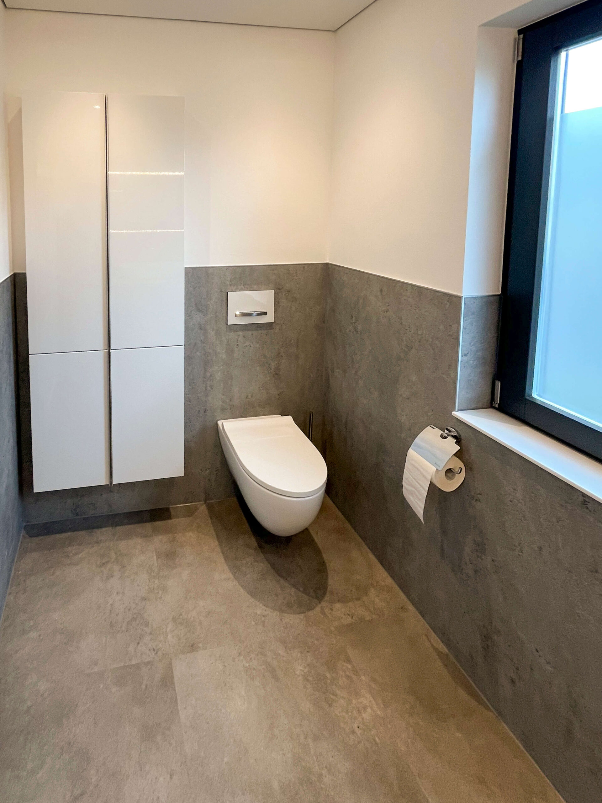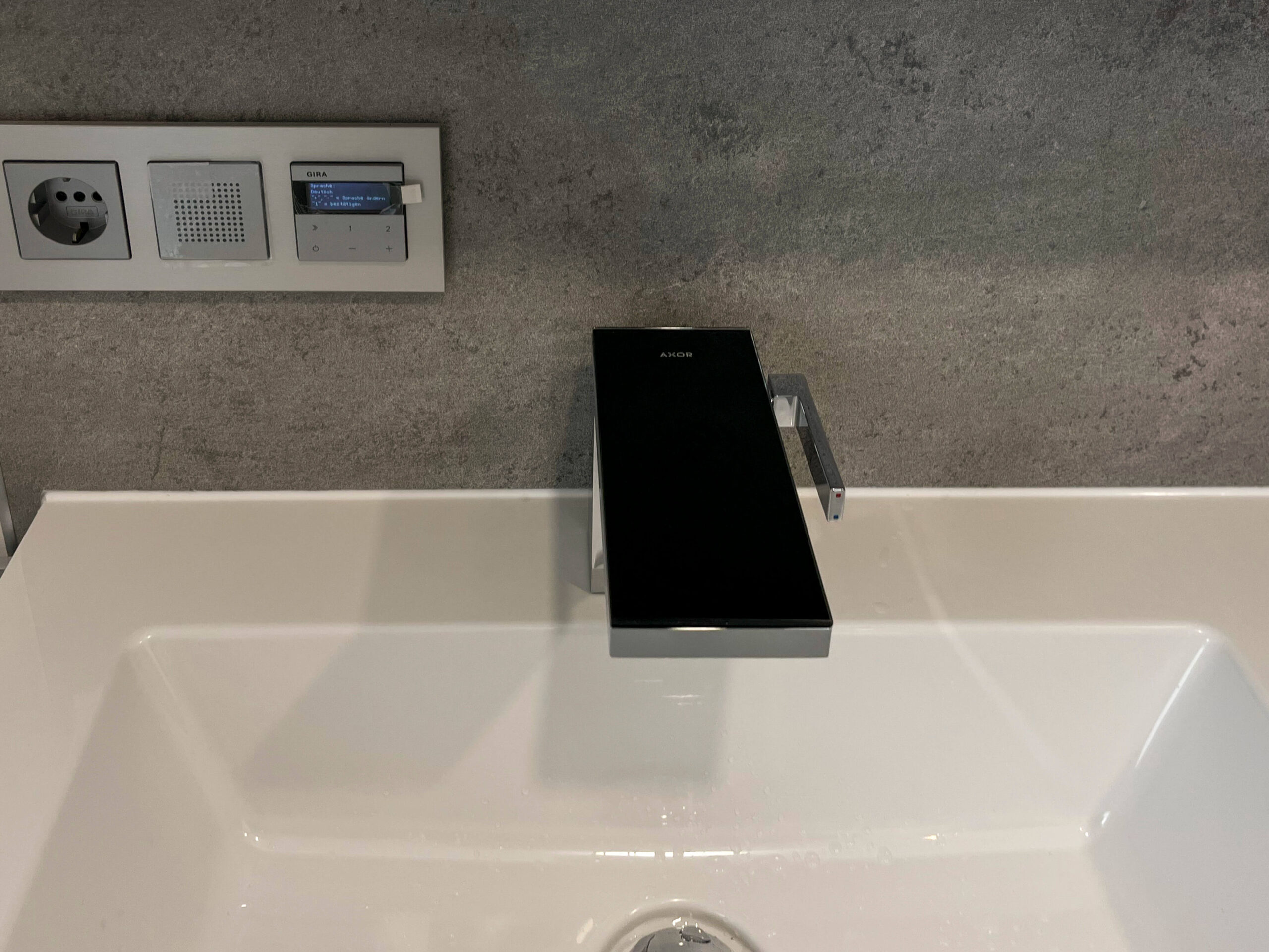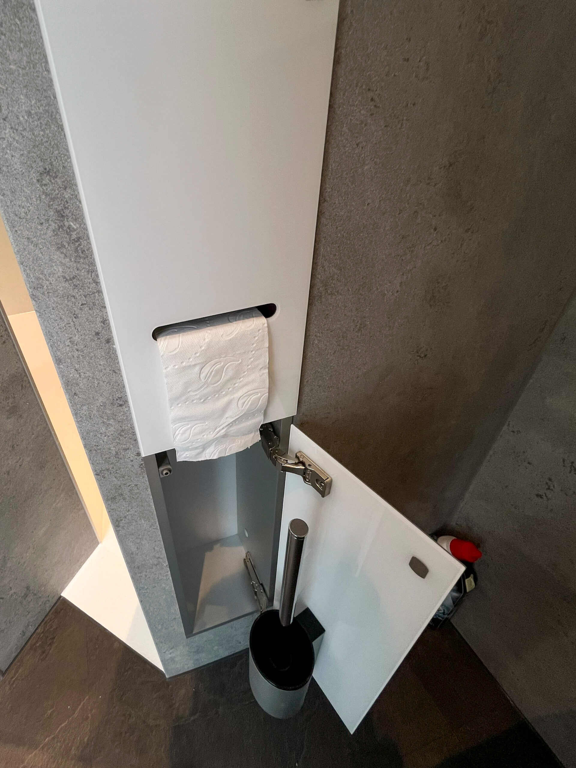 Besondere Details wie die in der Wand versteckte WC-Bürste oder die elegante MyEdition Axor Armatur machen das Bad zu einem einzigartigen Erlebnis. Die vollständig fugenlosen Oberflächen sorgen für eine edle Optik, leichte Pflege und dauerhafte Qualität.