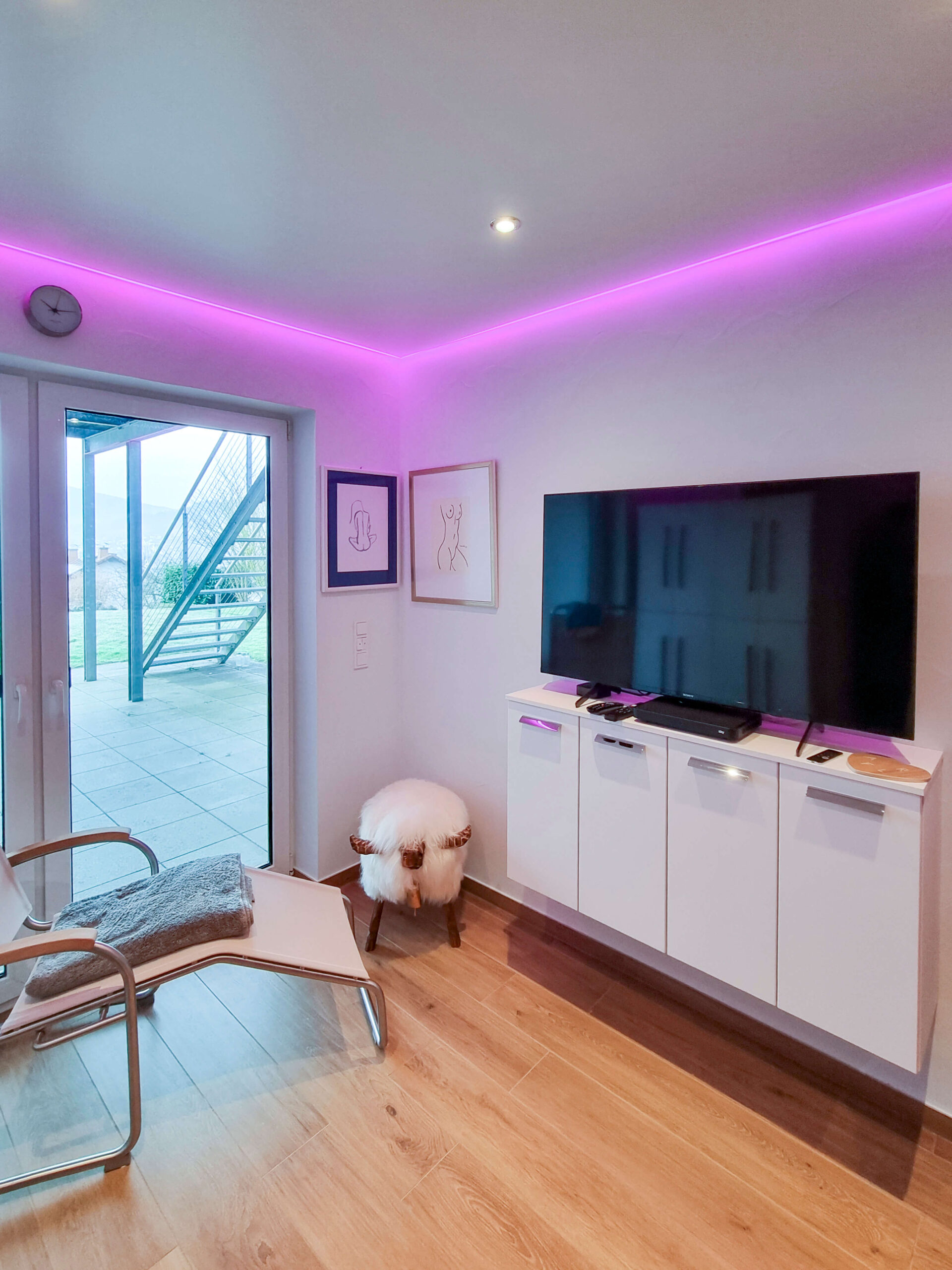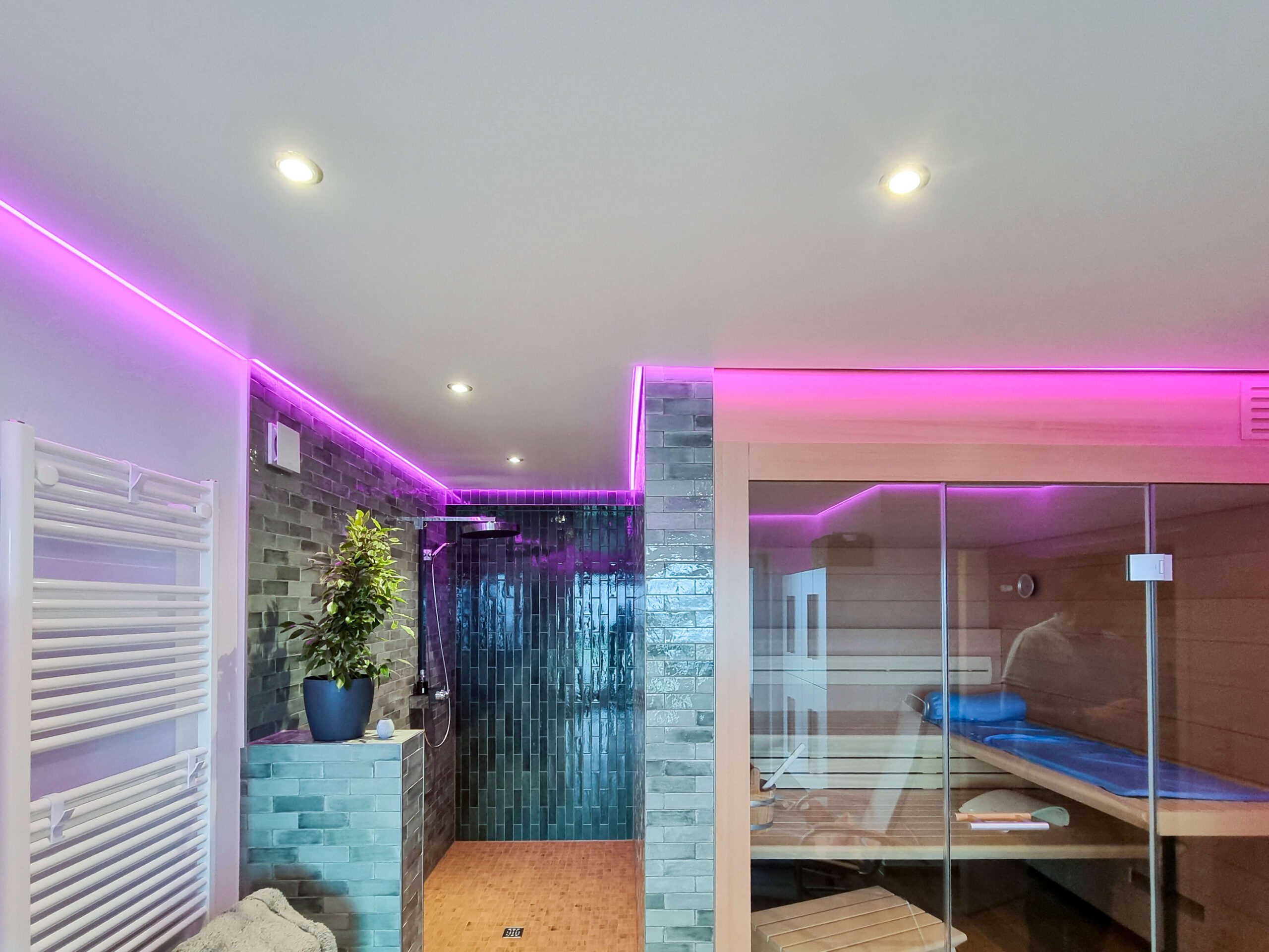 Für die nötige Abkühlung nach dem Saunagang sorgt ein moderner Duschbereich mit Regenbrause. Ein gemütlicher Liegestuhl und ein integrierter Fernseher schaffen zudem einen harmonischen Platz für Erholung und Ruhe. Abgerundet wird das Ambiente durch eine Spanndecke mit umlaufender Beleuchtung, die die perfekte Wellness-Stimmung erzeugt.